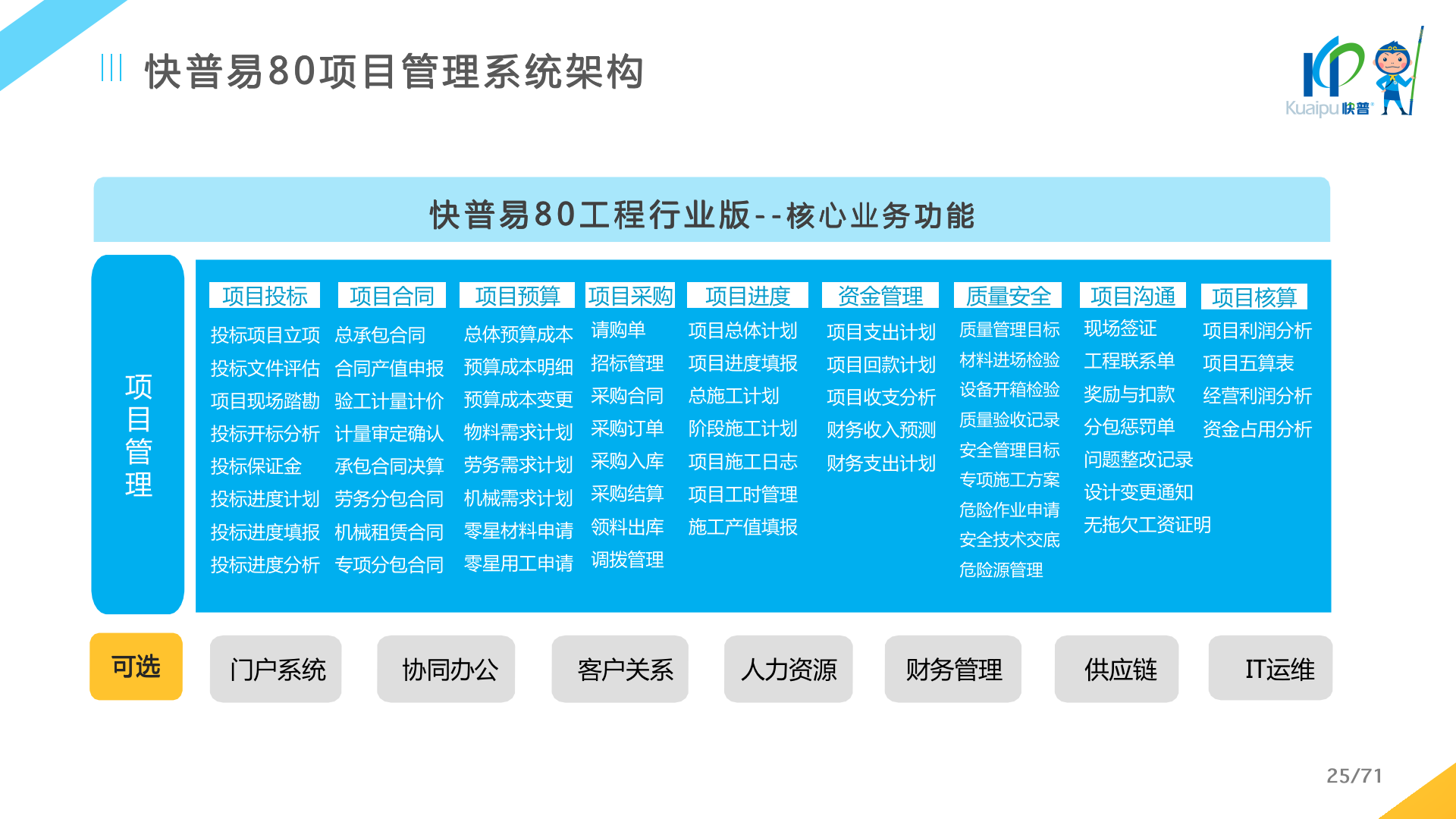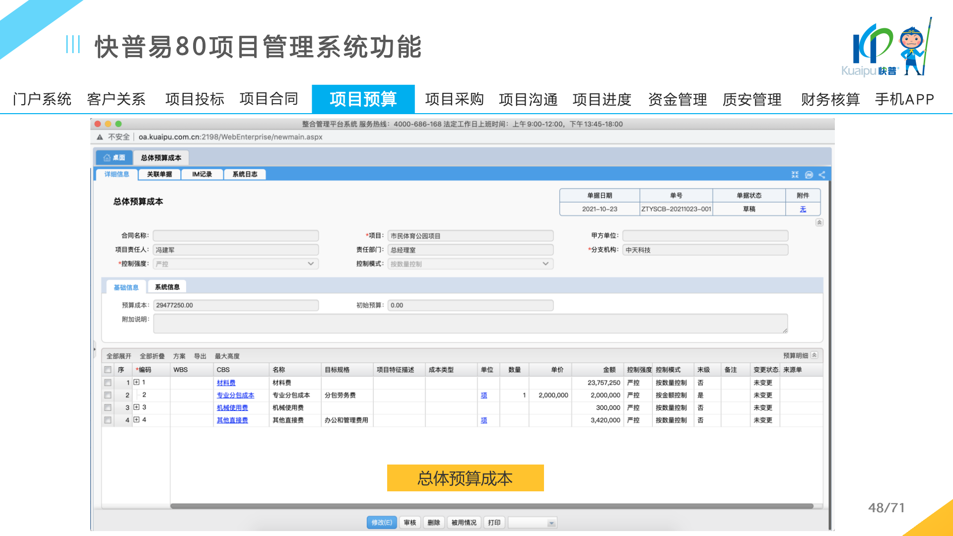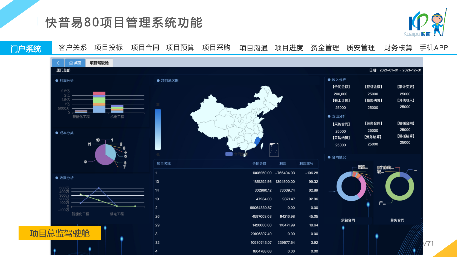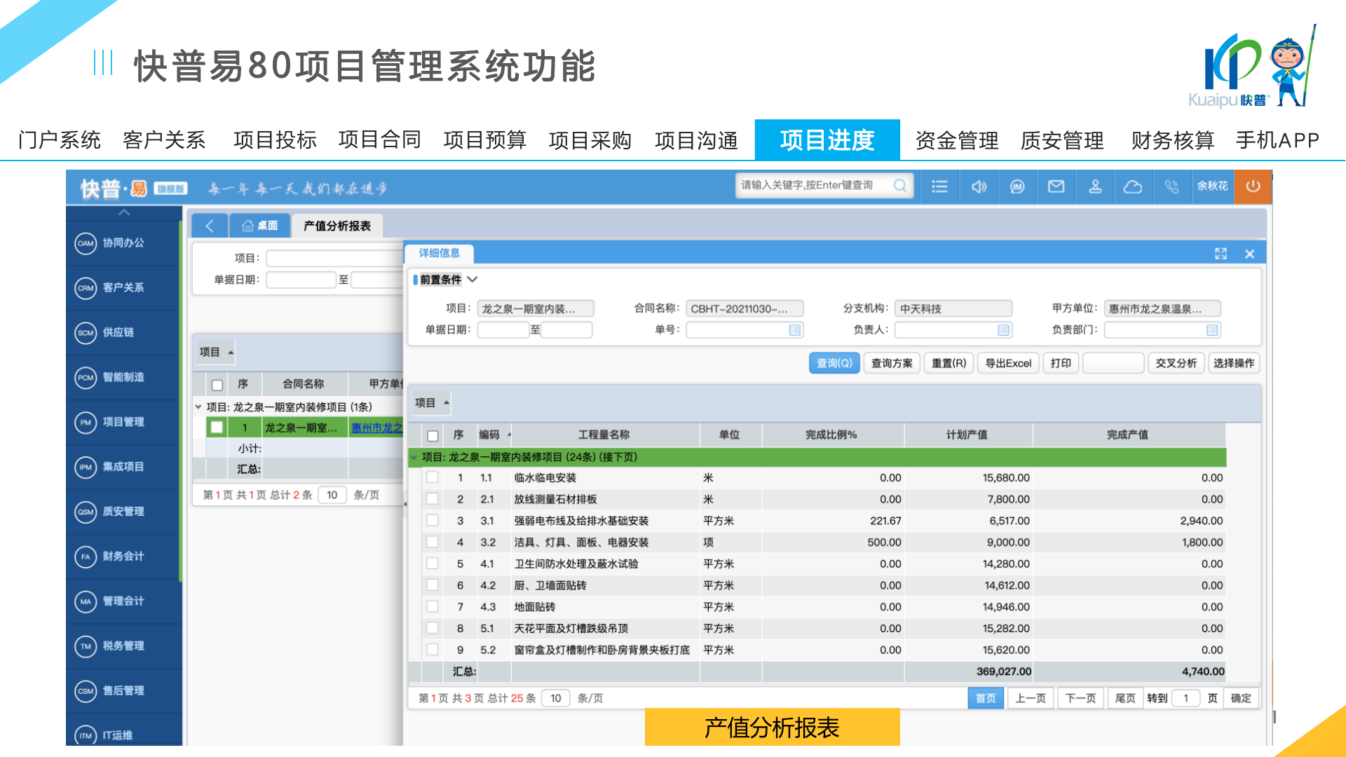 快普易80以項目管理為核心,通過“四控、四管、一協(xié)調(diào)”方式,對項目進(jìn)度、成本、資金、質(zhì)量安全進(jìn)行全面控制,實現(xiàn)投標(biāo)管理、合同管理、物資管理、預(yù)算管理等項目全生命周期項目的數(shù)字化管理,實現(xiàn)資源合理配置、保障良好的項目效益。