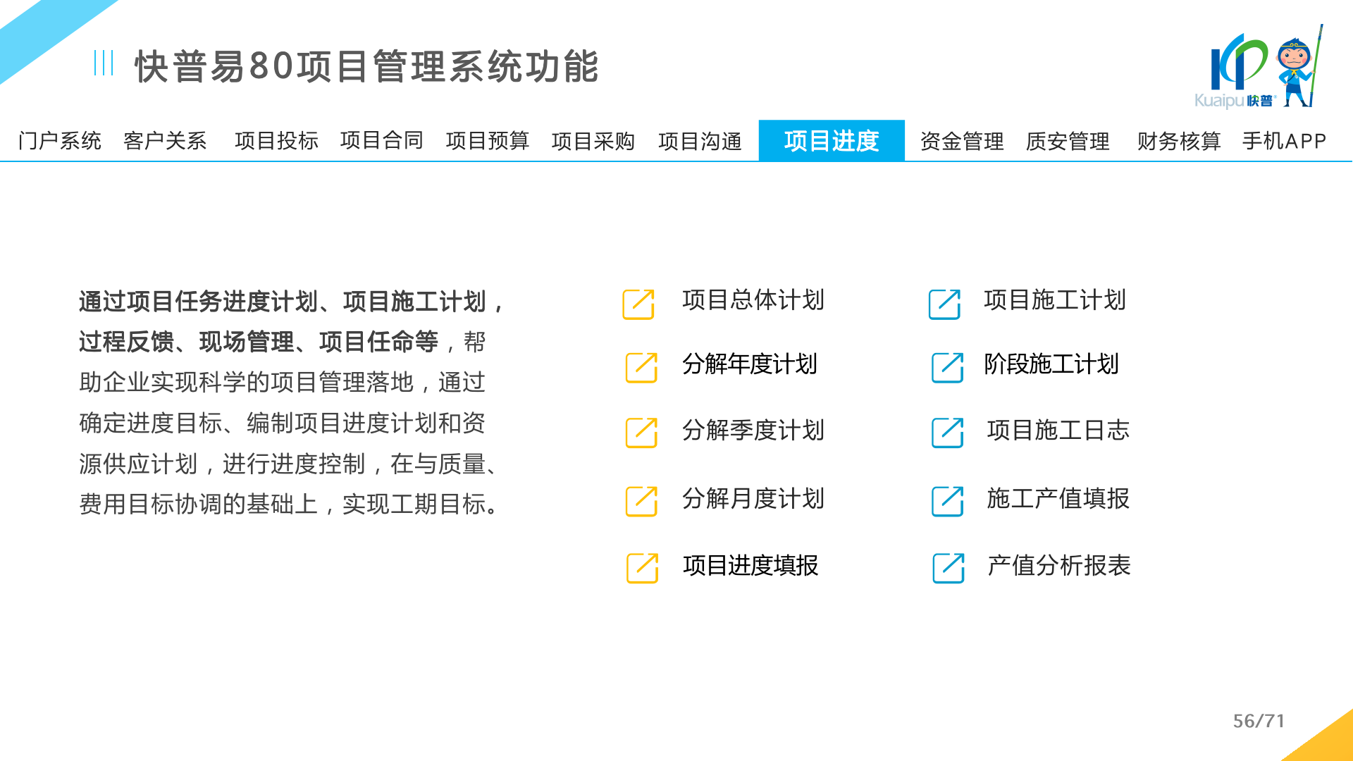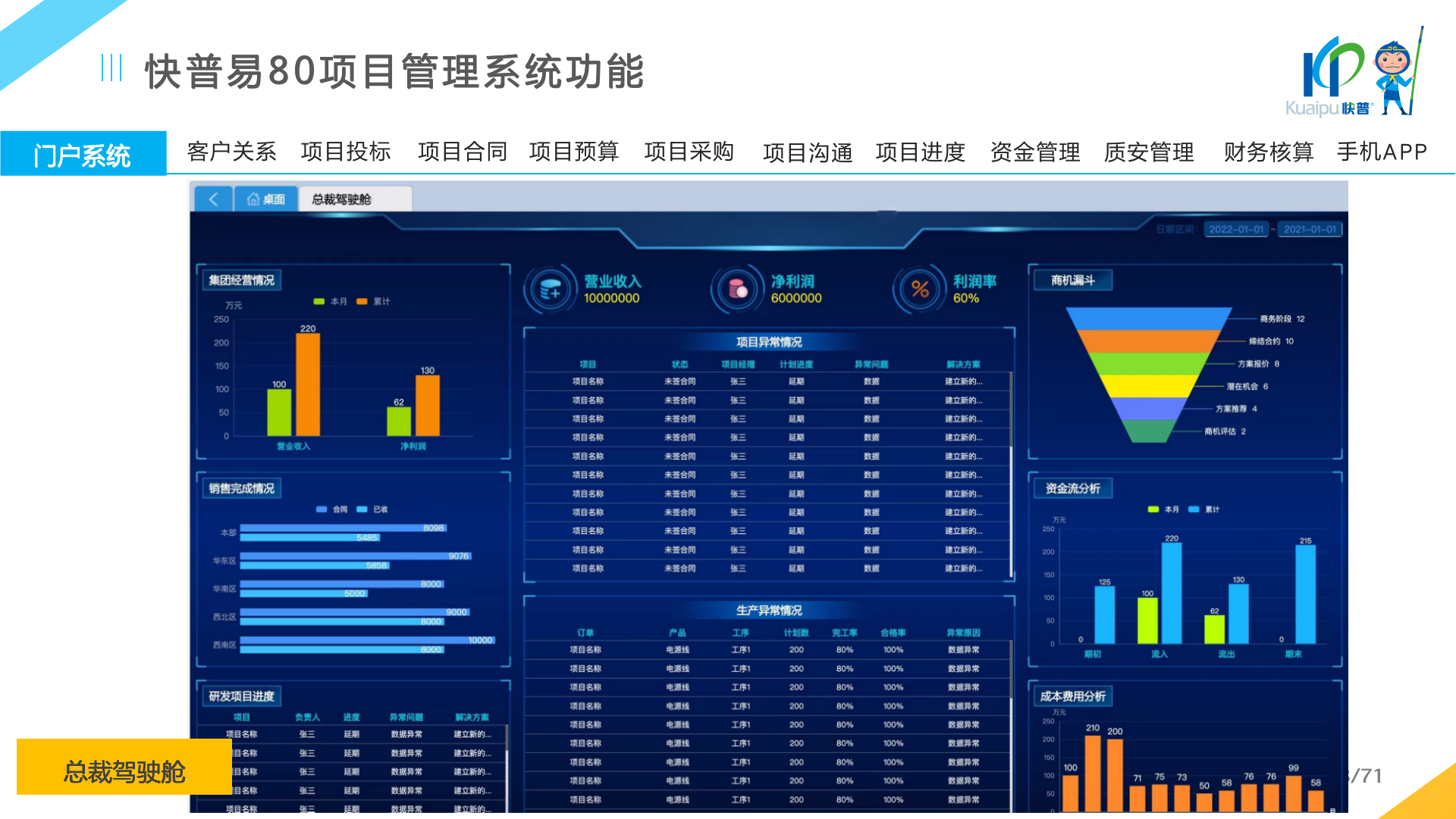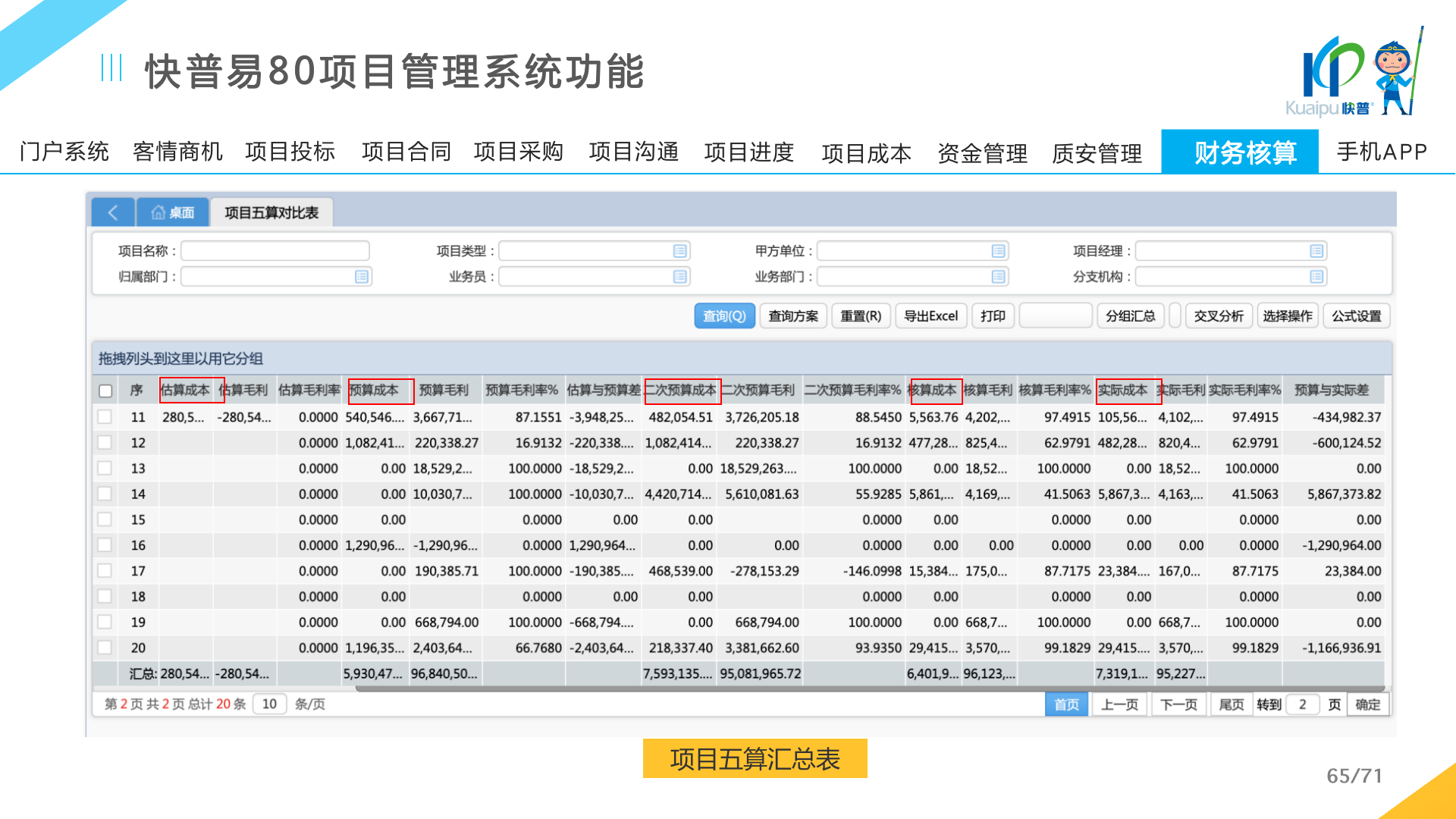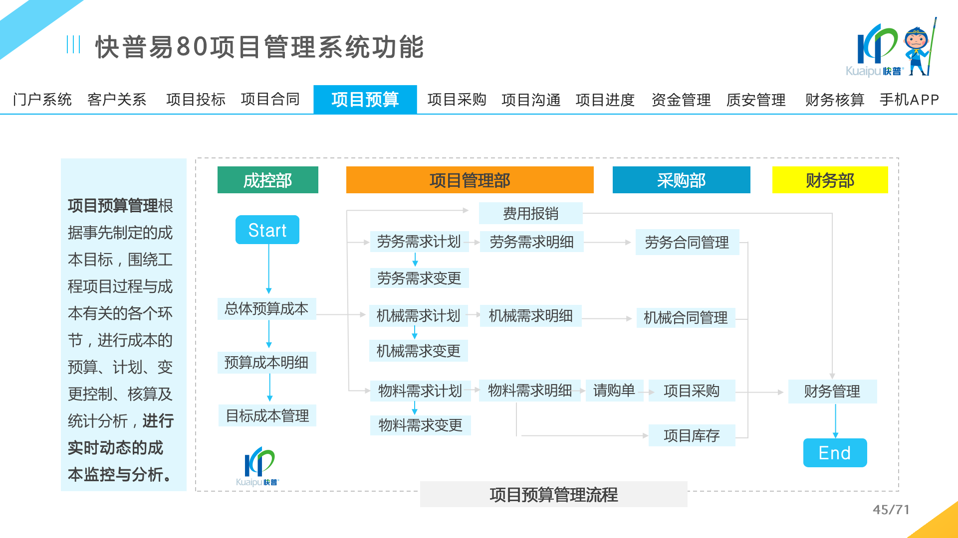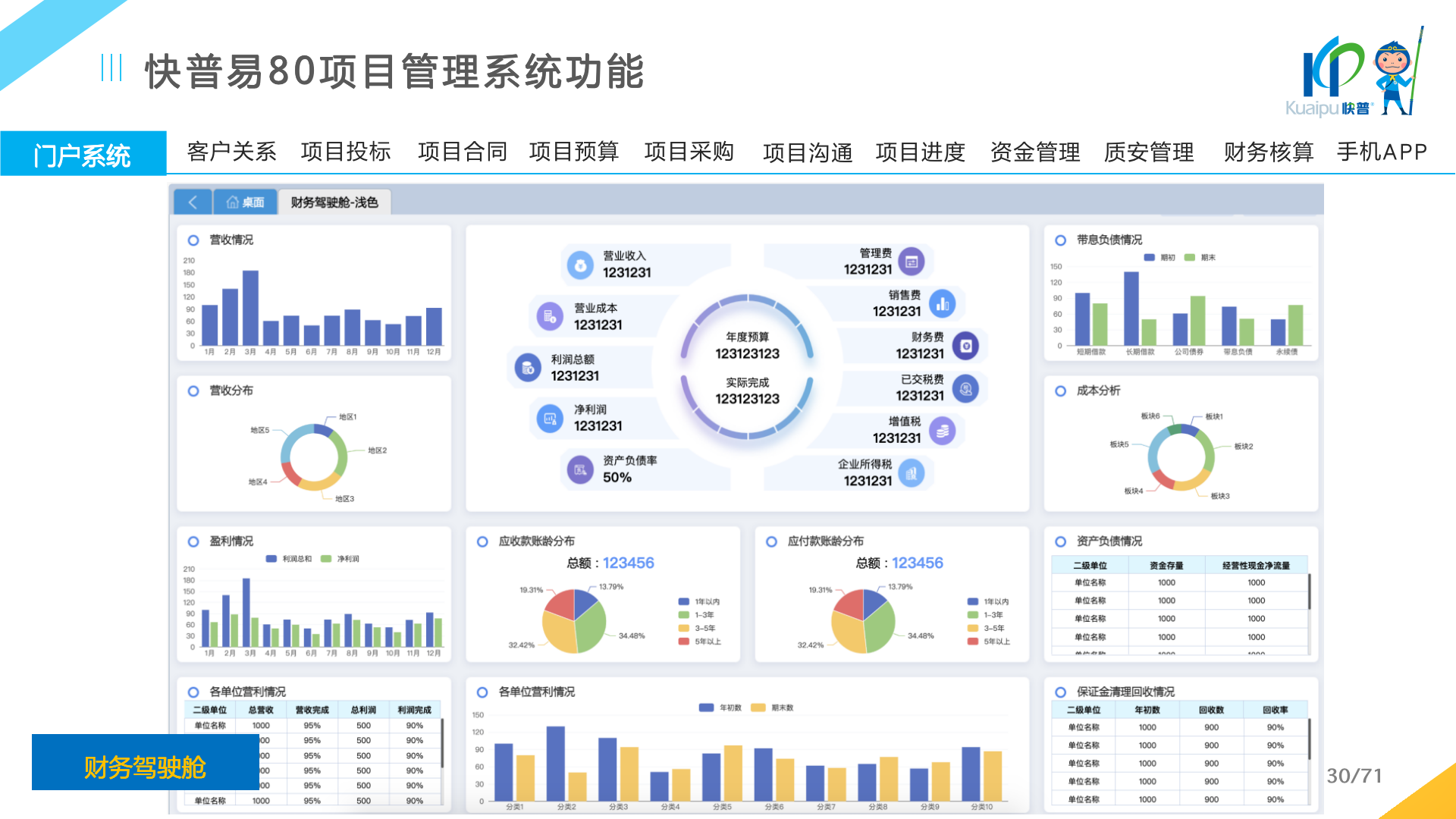 快普易80以項目管理為核心,通過“四控、四管、一協(xié)調(diào)”方式,對項目進(jìn)度、成本、資金、質(zhì)量安全進(jìn)行全面控制,實現(xiàn)投標(biāo)管理、合同管理、物資管理、預(yù)算管理等項目全生命周期項目的數(shù)字化管理,實現(xiàn)資源合理配置、保障良好的項目效益。