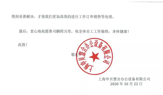 近日,上海申貝慧合辦公設(shè)備有限公司(以下簡(jiǎn)稱“申貝慧合”)向我司發(fā)來(lái)感謝信。