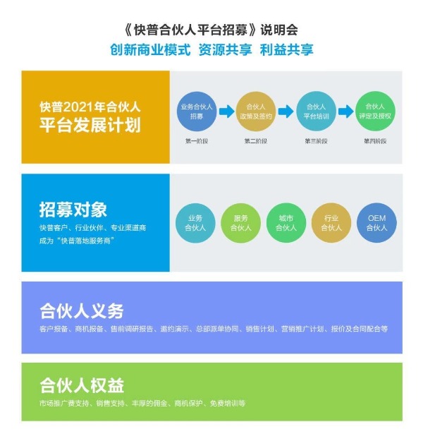 快普合伙人平臺將依托快普整合管理、專注細分行業(yè)與強大的技術(shù)平臺支持三大優(yōu)勢,面向各行各業(yè)招募合伙人,通過多種合作形式,建立“快普落地服務(wù)商”,幫助全國更多企業(yè)實現(xiàn)信息化轉(zhuǎn)型,提高企業(yè)的技術(shù)創(chuàng)新能力與品牌價值。
