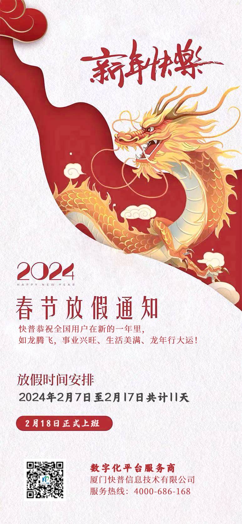 2024年春節(jié)即將到來(lái),快普公司全體員工提前恭祝快普用戶在新的一年里,龍馬精神,龍騰虎躍,事業(yè)如日中天,生活步步高升!感謝您長(zhǎng)期以來(lái)對(duì)我們工作的理解和支持。