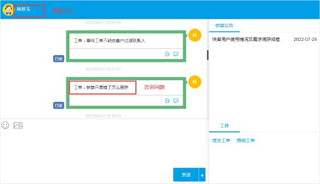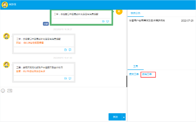 方法一、 通過會(huì)話窗口右邊“查詢工單”即可查看所有提交過的問題
