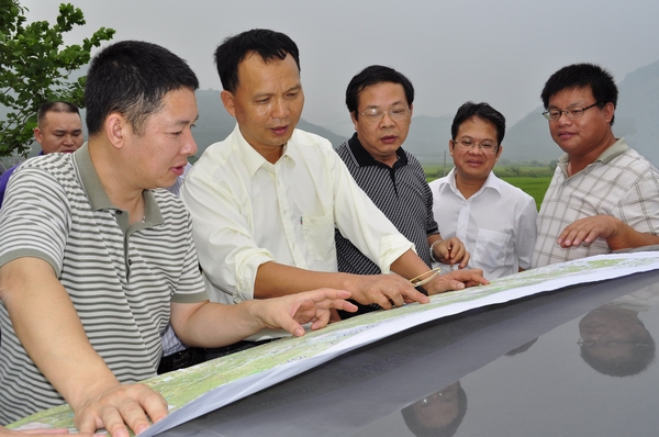 圖二:集團(tuán)公司李定倫總經(jīng)理(右4)、覃炳賢總工程師(右3)考察來(lái)賓至馬山、馬山至平果高速公路項(xiàng)目。